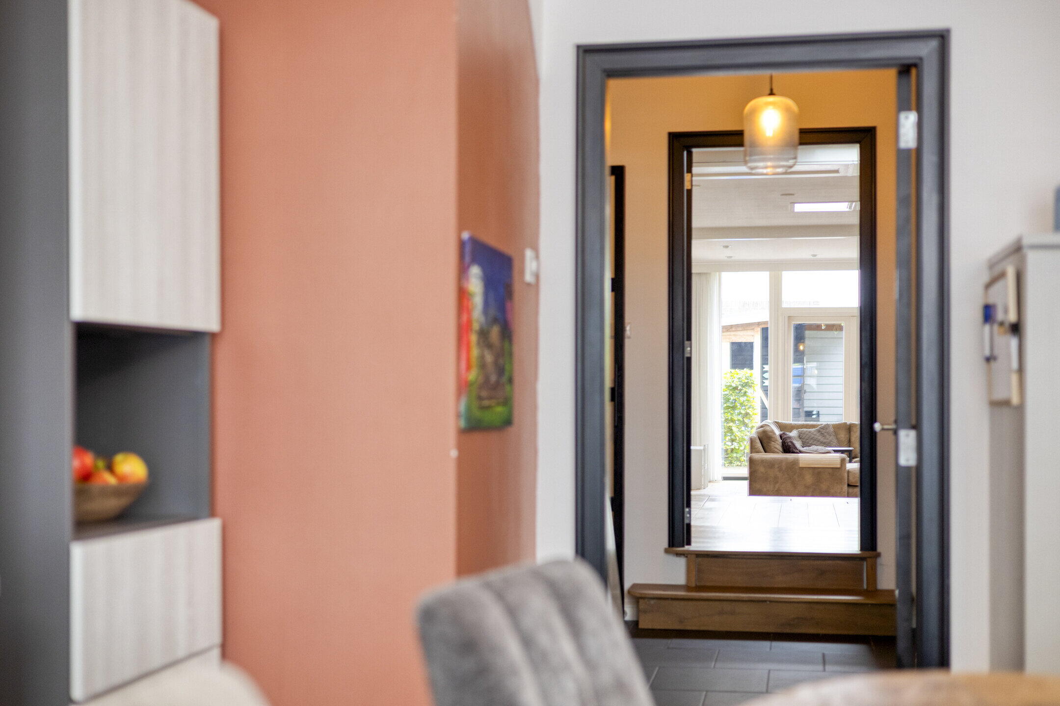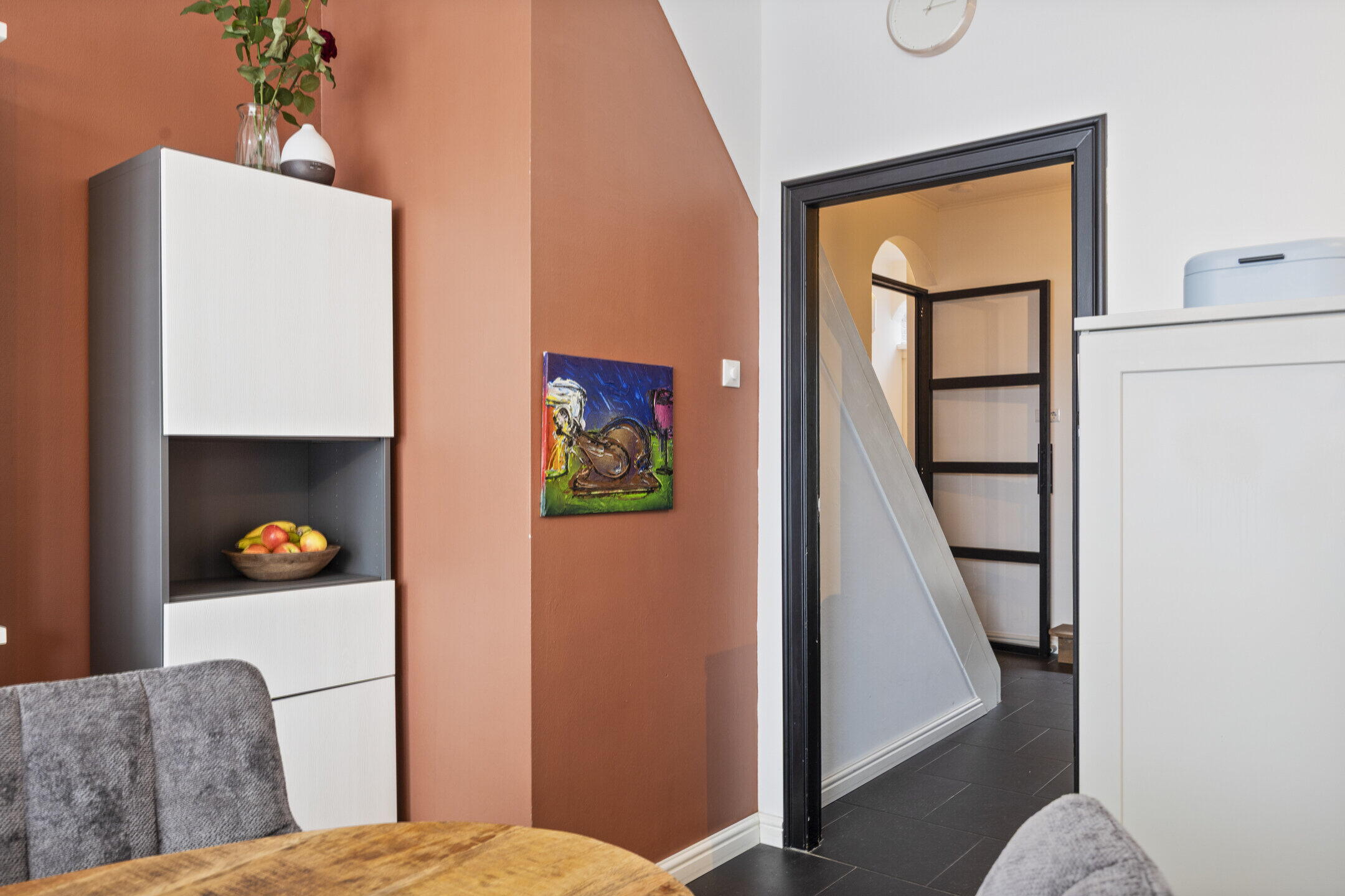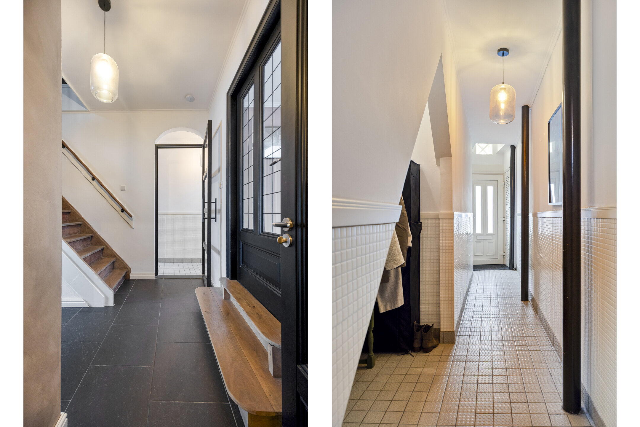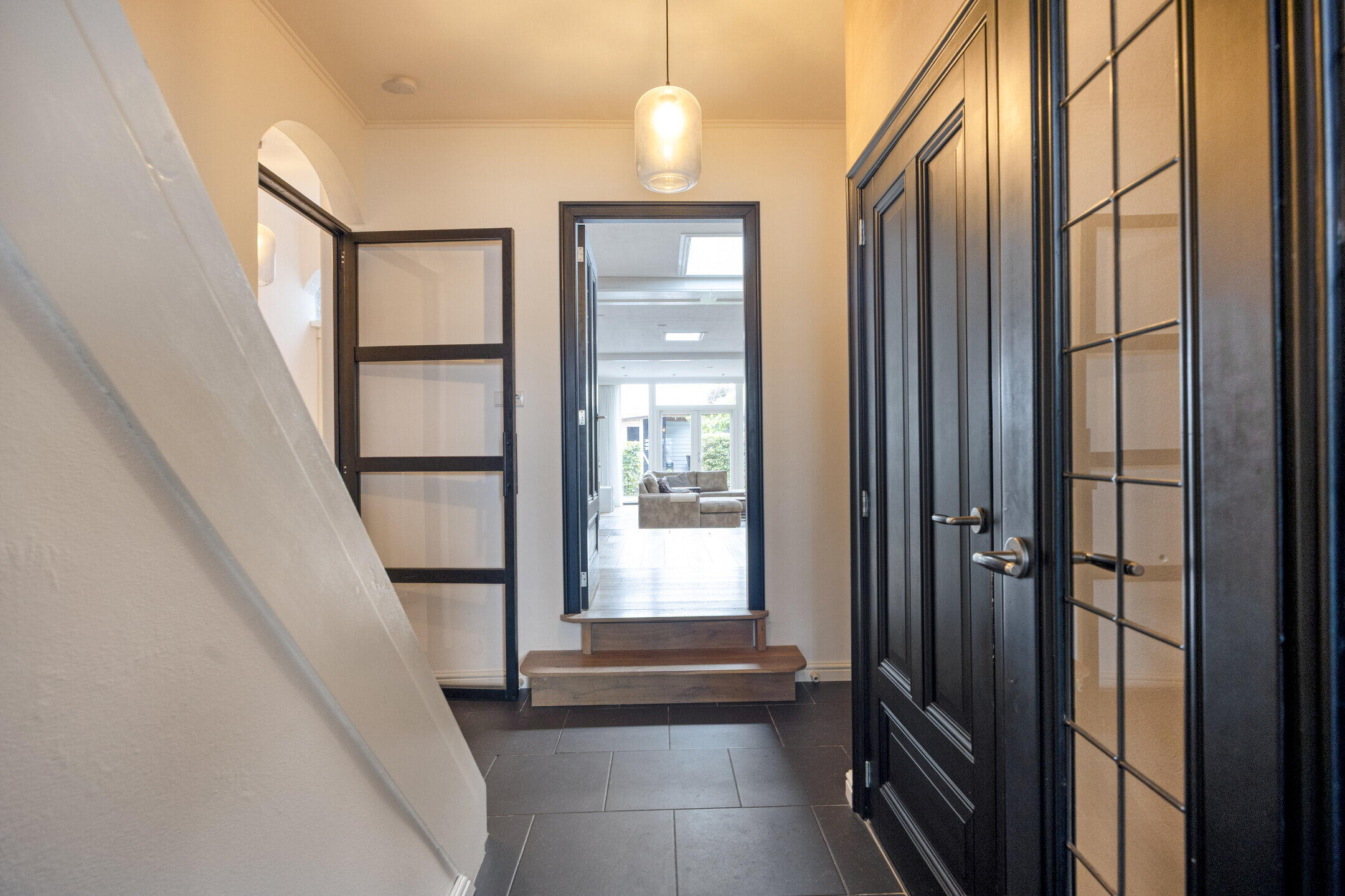 Je komt binnen via de voordeur en stapt een lange, smalle hal binnen die je doorleidt naar de centrale gang. Daar wacht je een stijlvolle verrassing: een chique uitstraling met een bruine trap, zwarte deuren en genoeg ruimte voor een garderobe. Vanuit deze gang heb je toegang tot de trap naar boven, het toilet, de gesloten keuken, bijkeuken én de woonkamer.
