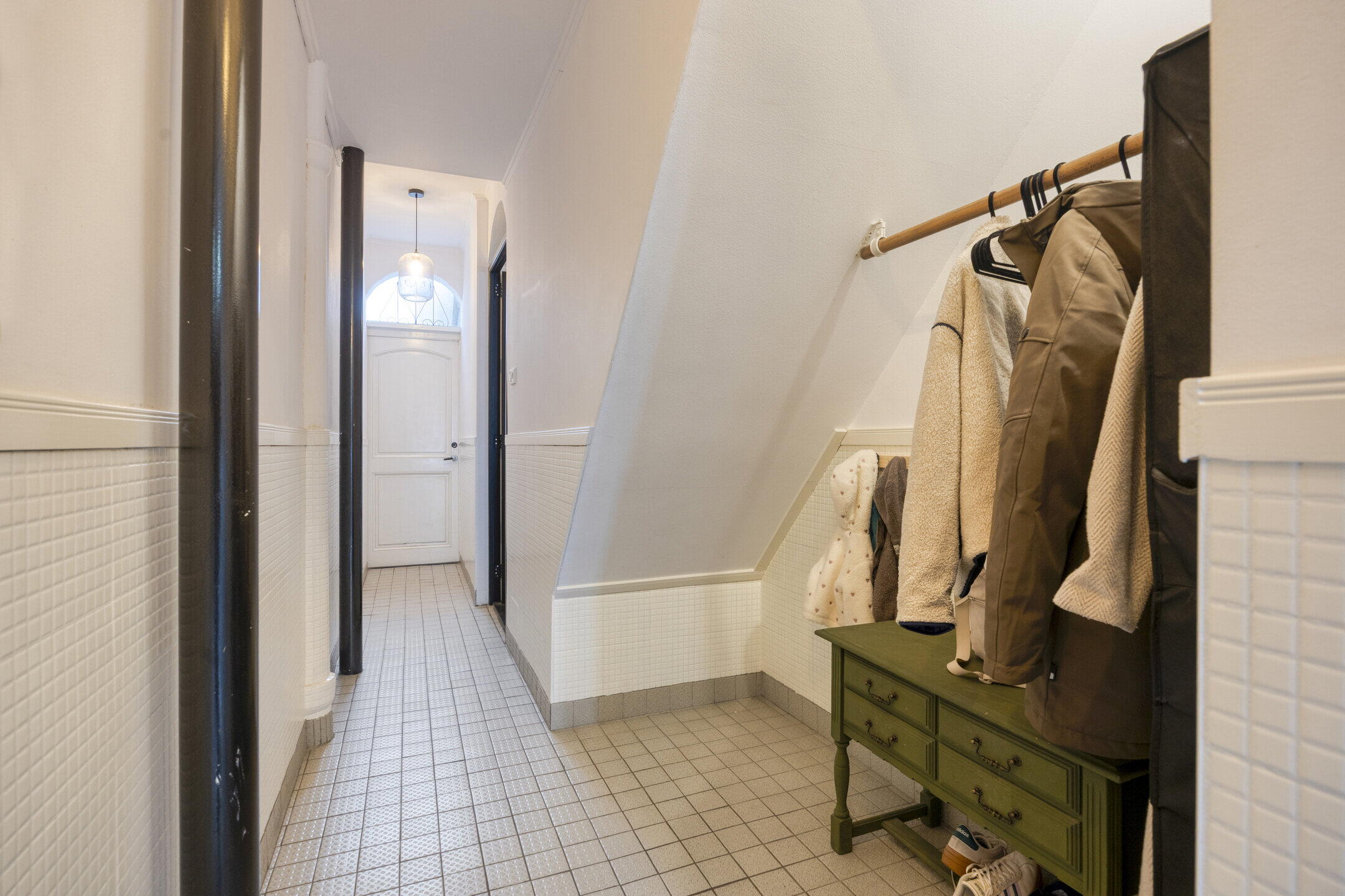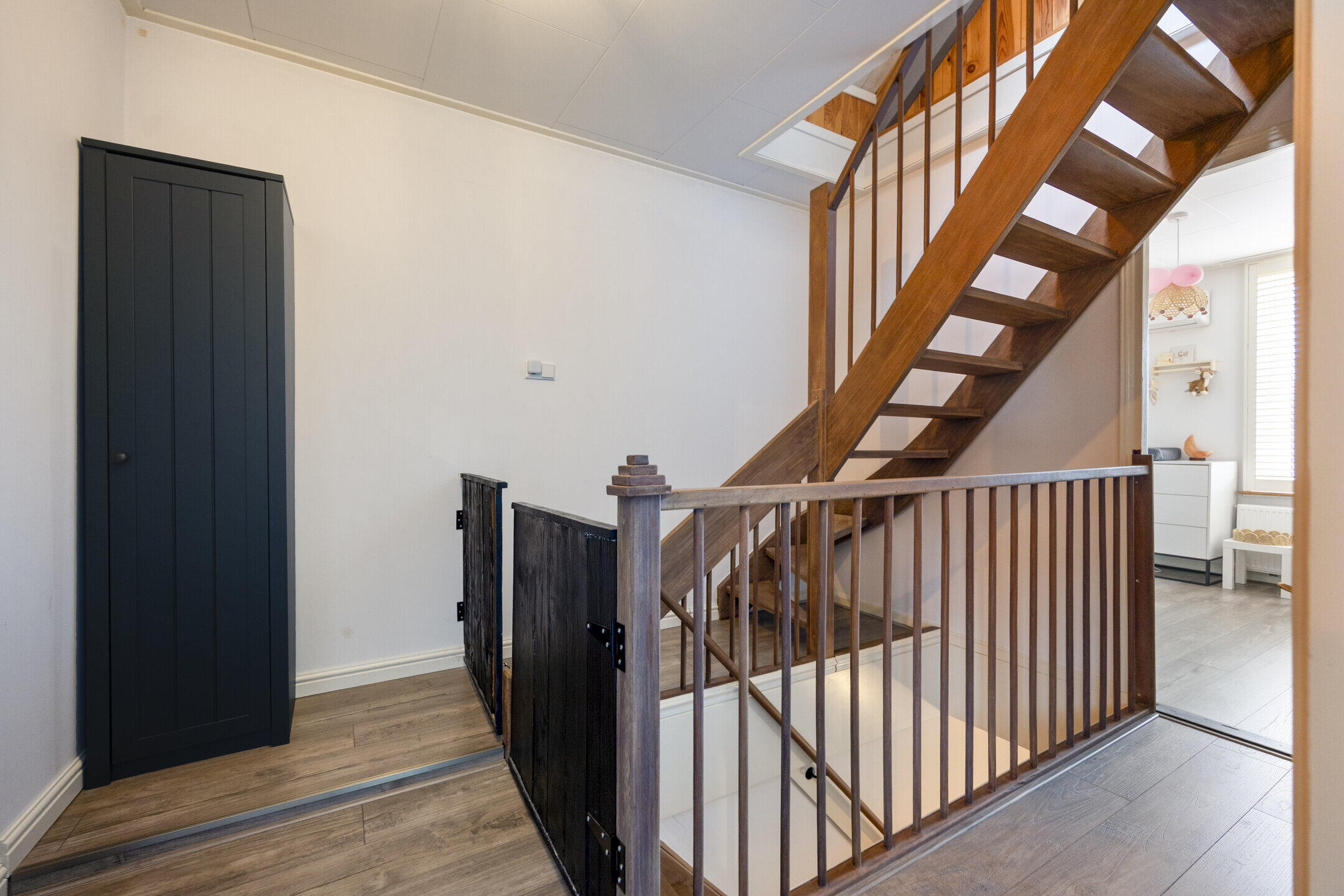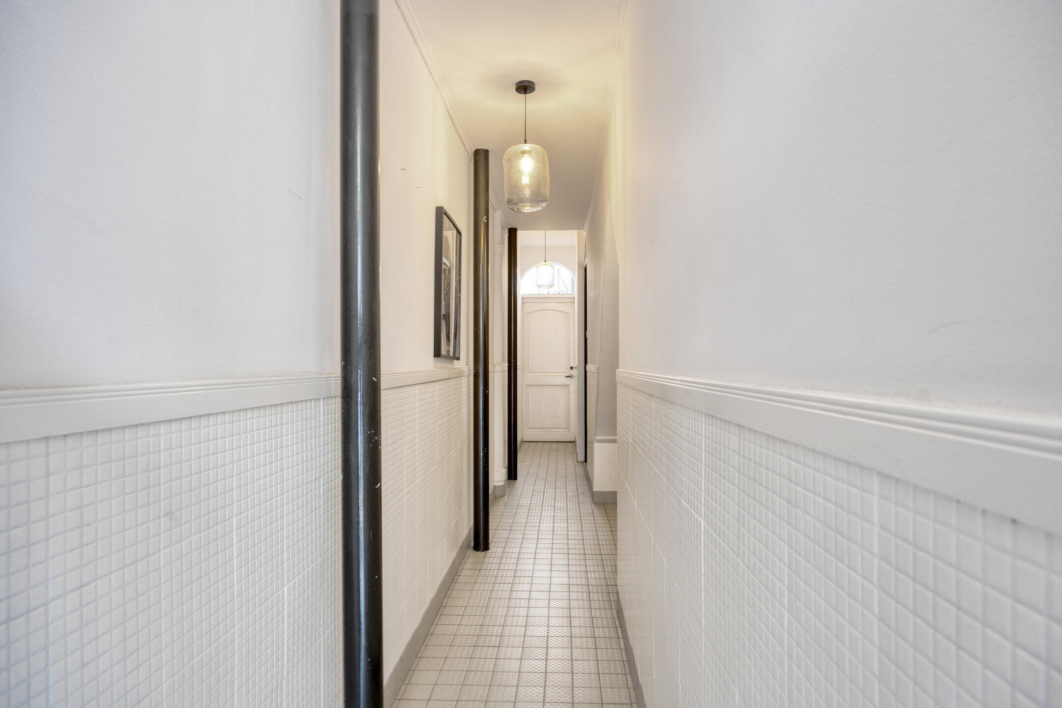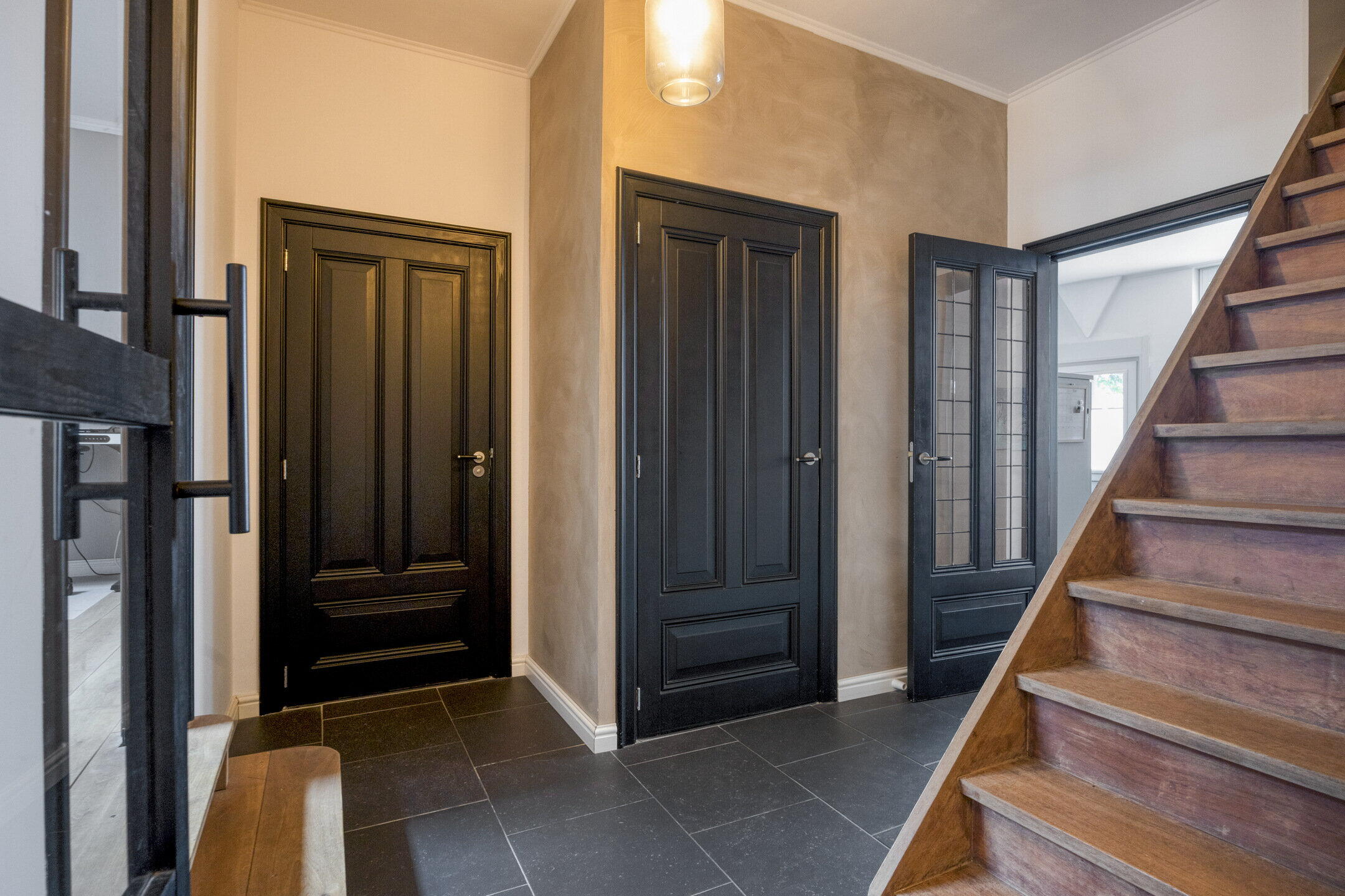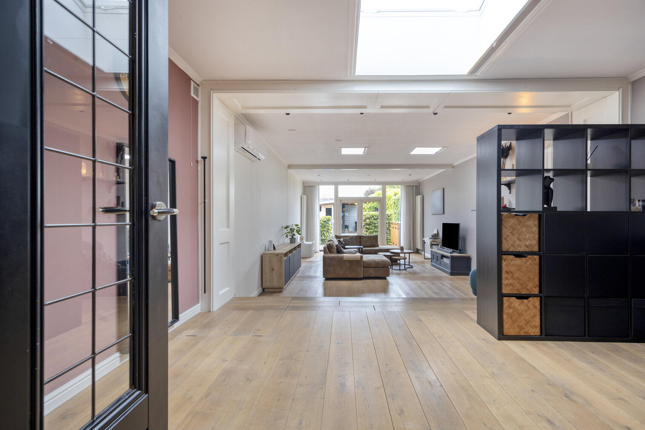 Je komt binnen via de voordeur en stapt een lange, smalle hal binnen die je doorleidt naar de centrale gang. Daar wacht je een stijlvolle verrassing: een chique uitstraling met een bruine trap, zwarte deuren en genoeg ruimte voor een garderobe. Vanuit deze gang heb je toegang tot de trap naar boven, het toilet, de gesloten keuken, bijkeuken én de woonkamer.