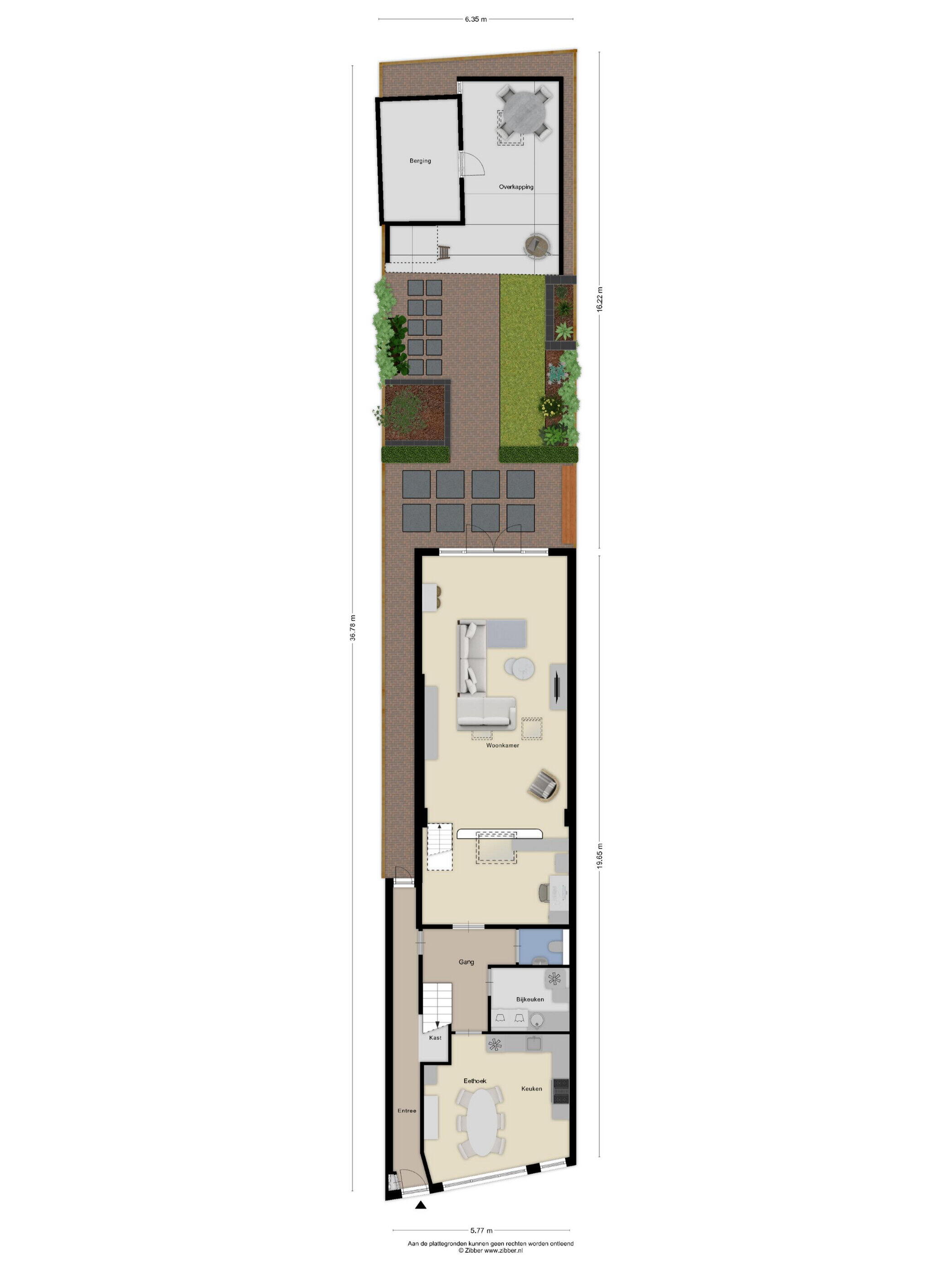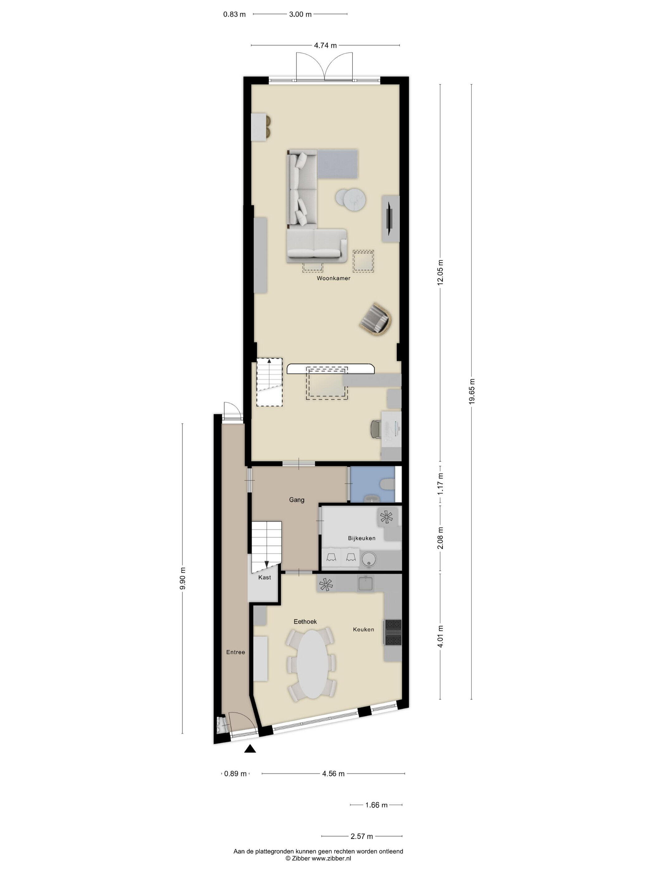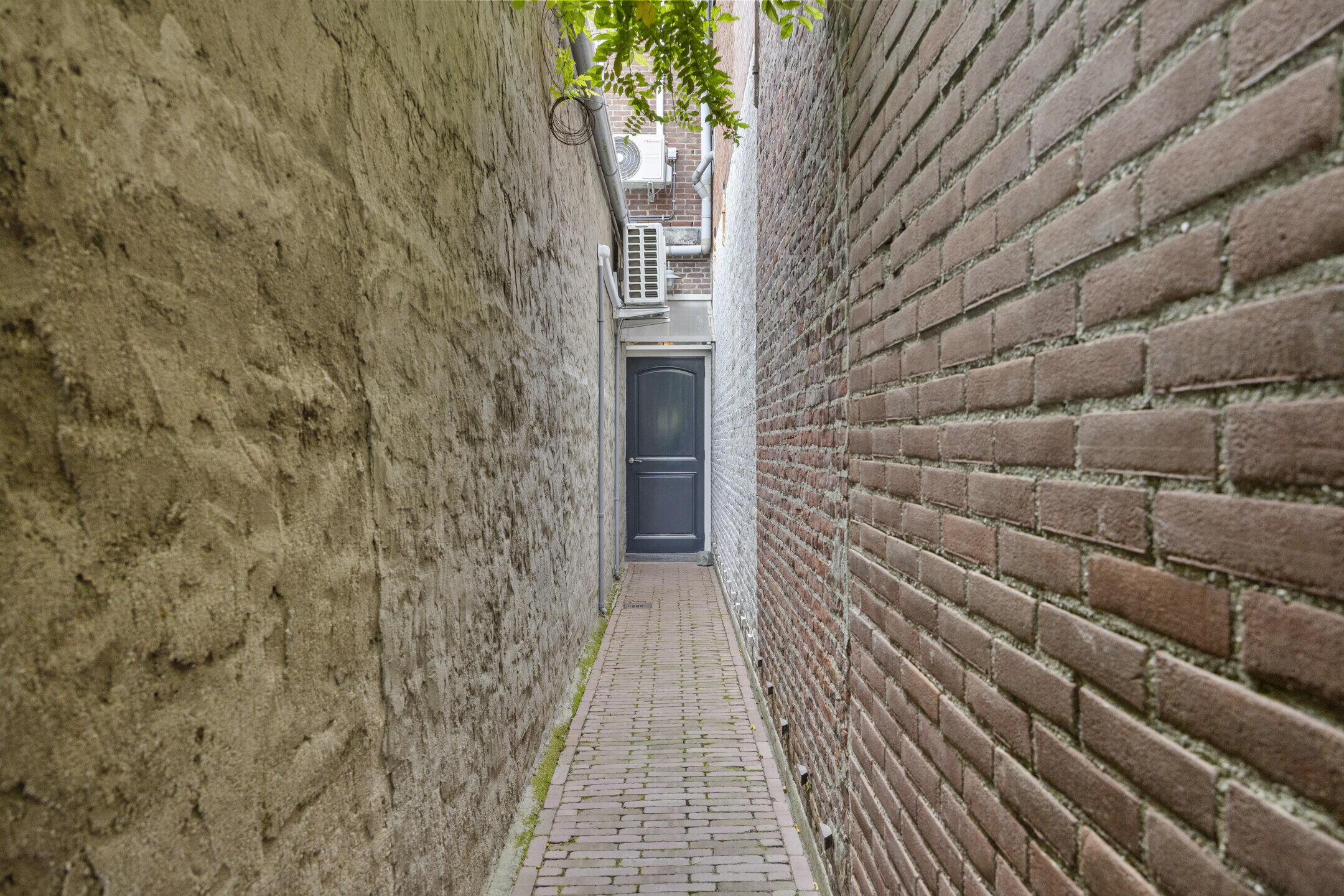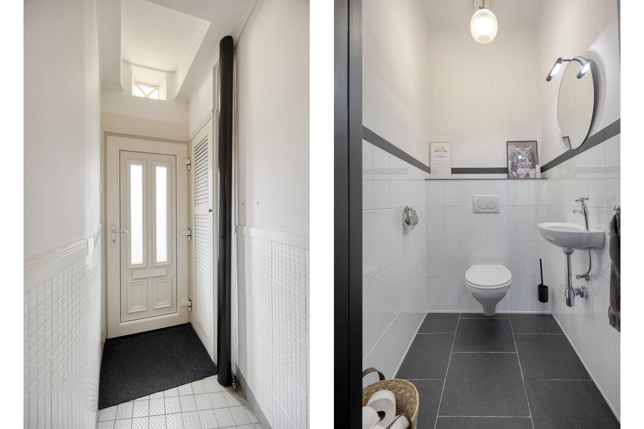 Je komt binnen via de voordeur en stapt een lange, smalle hal binnen die je doorleidt naar de centrale gang. Daar wacht je een stijlvolle verrassing: een chique uitstraling met een bruine trap, zwarte deuren en genoeg ruimte voor een garderobe. Vanuit deze gang heb je toegang tot de trap naar boven, het toilet, de gesloten keuken, bijkeuken én de woonkamer.