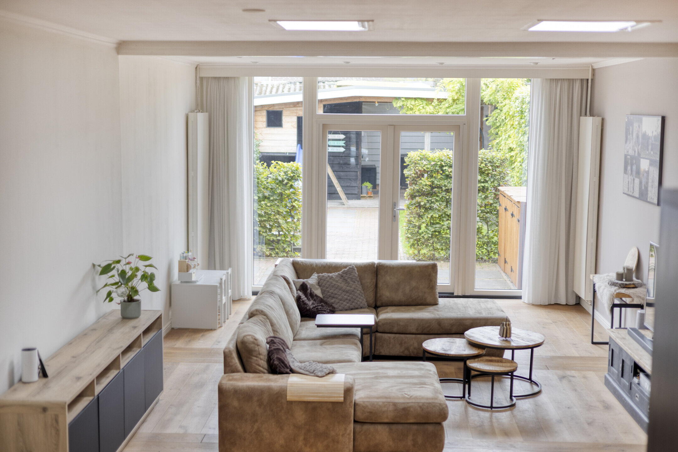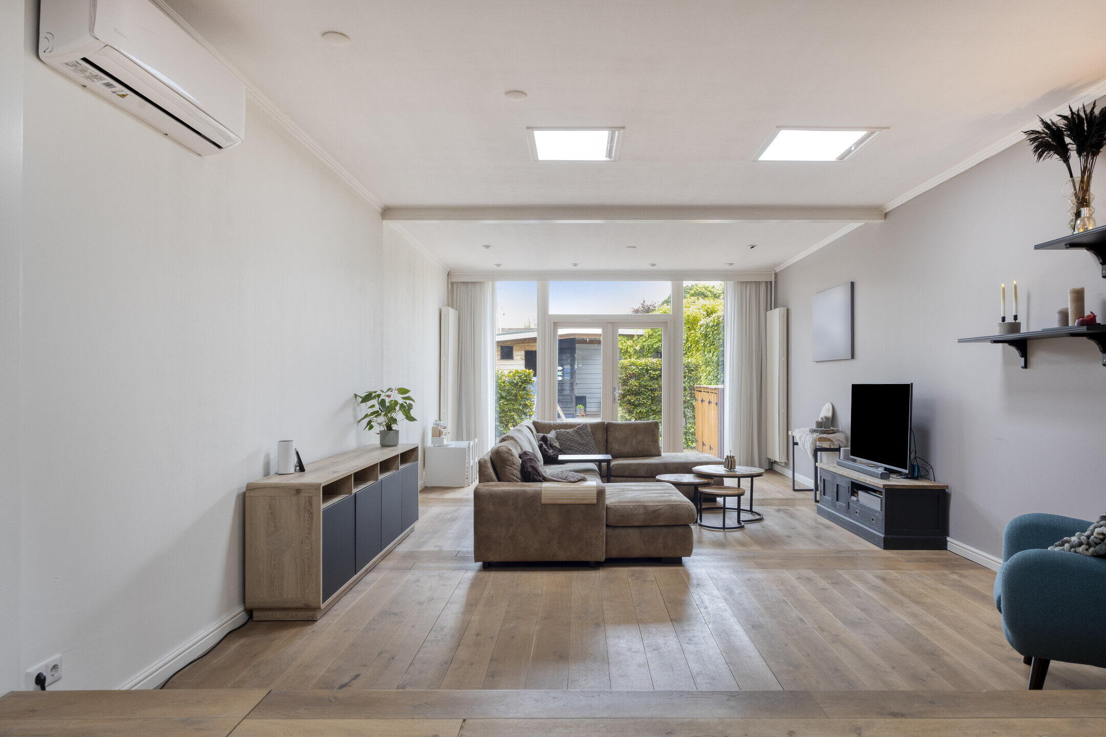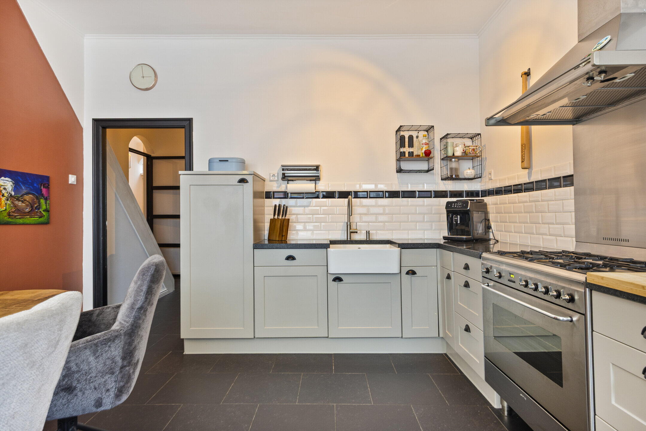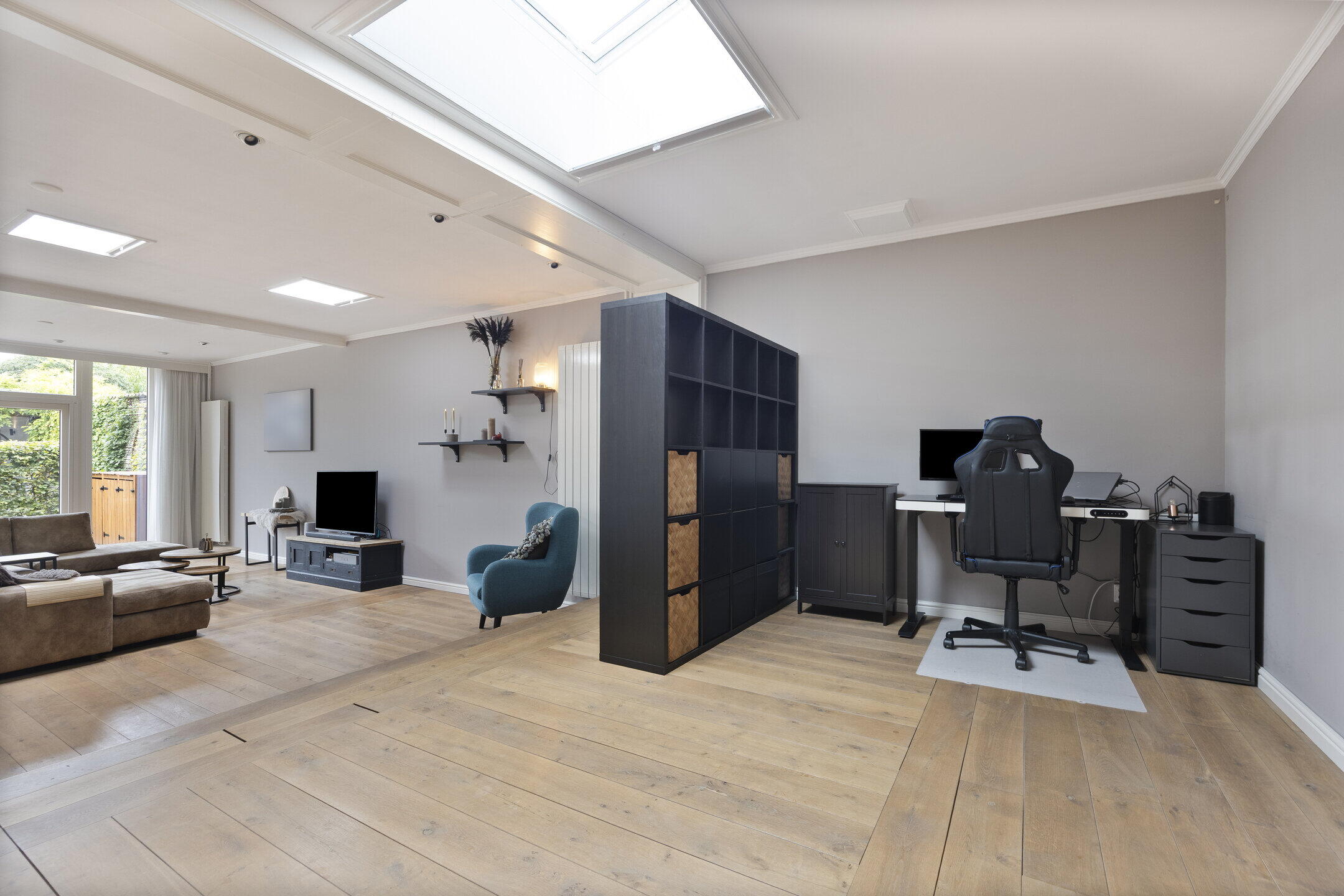 De woonkamer bevindt zich aan de achterzijde van de woning en is verdeeld in twee niveaus, gescheiden door twee tredes. Dit creëert niet alleen een speels effect, maar ook mogelijkheden qua indeling. Het hogere gedeelte is momenteel ingericht als thuiskantoor, maar kan ook dienen als leeshoek of speelhoek. Het lagere gedeelte biedt volop ruimte voor een gezellige zithoek met uitzicht op de tuin. Meerdere ramen in het dak zorgen voor een prachtige lichtinval en er is een airco voor extra comfort. Aan de voorzijde van de woning vinden we de gesloten keuken, waar je met gemak een eethoek voor zes personen kwijt kunt. De keuken is uitgevoerd in een stijlvolle groen-grijze kleur met zwarte handgrepen en een donker blad. Je vindt hier een fornuis, oven, afzuigkap, vaatwasser én een quooker. In de aangrenzende bijkeuken is ruimte voor wasmachine, droger én een extra koelkast.
