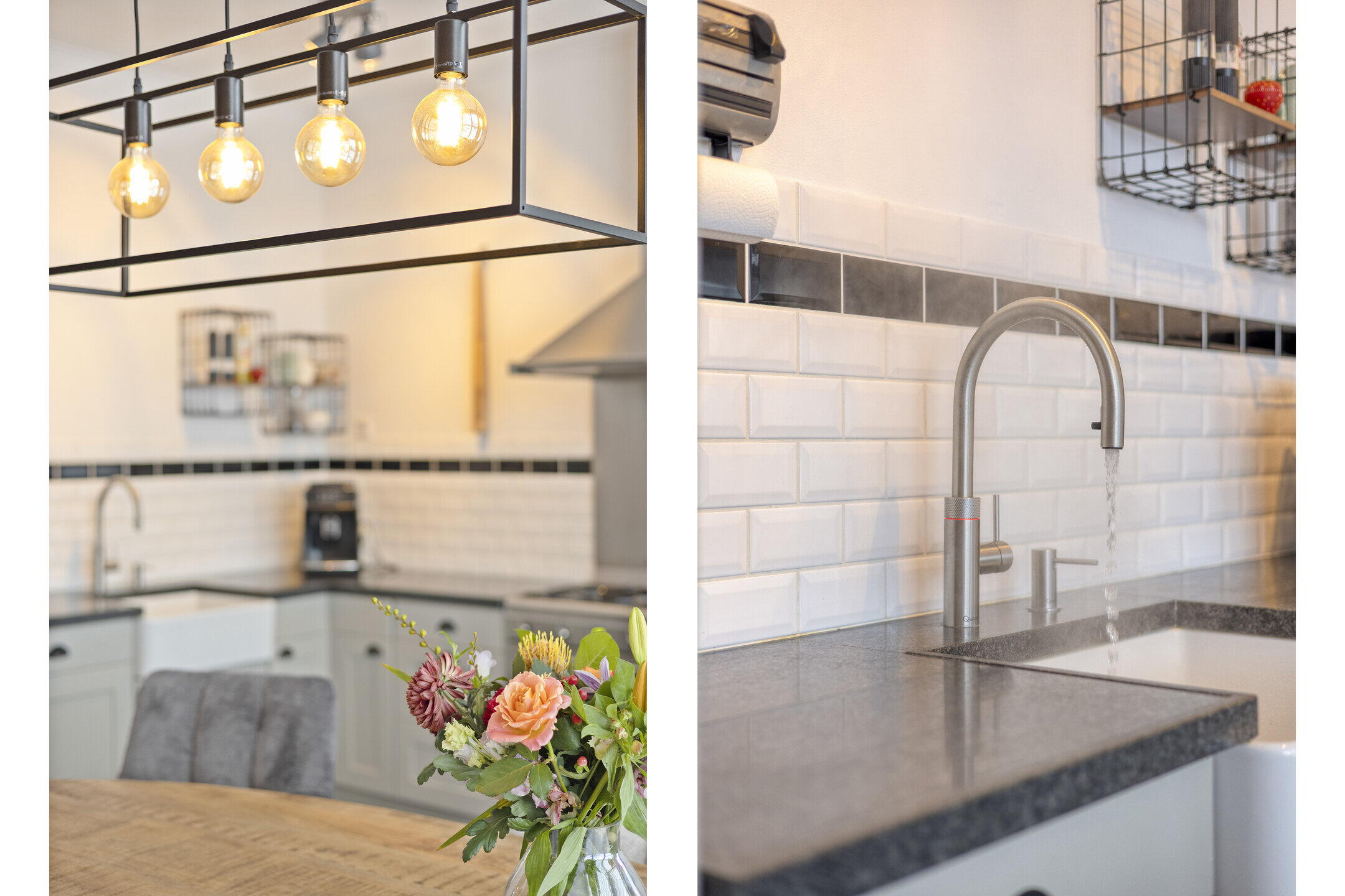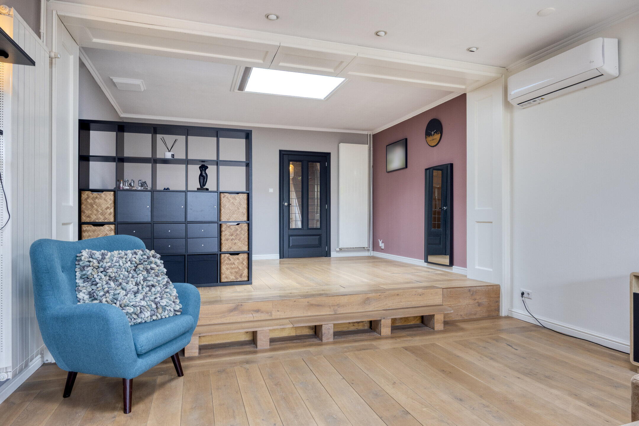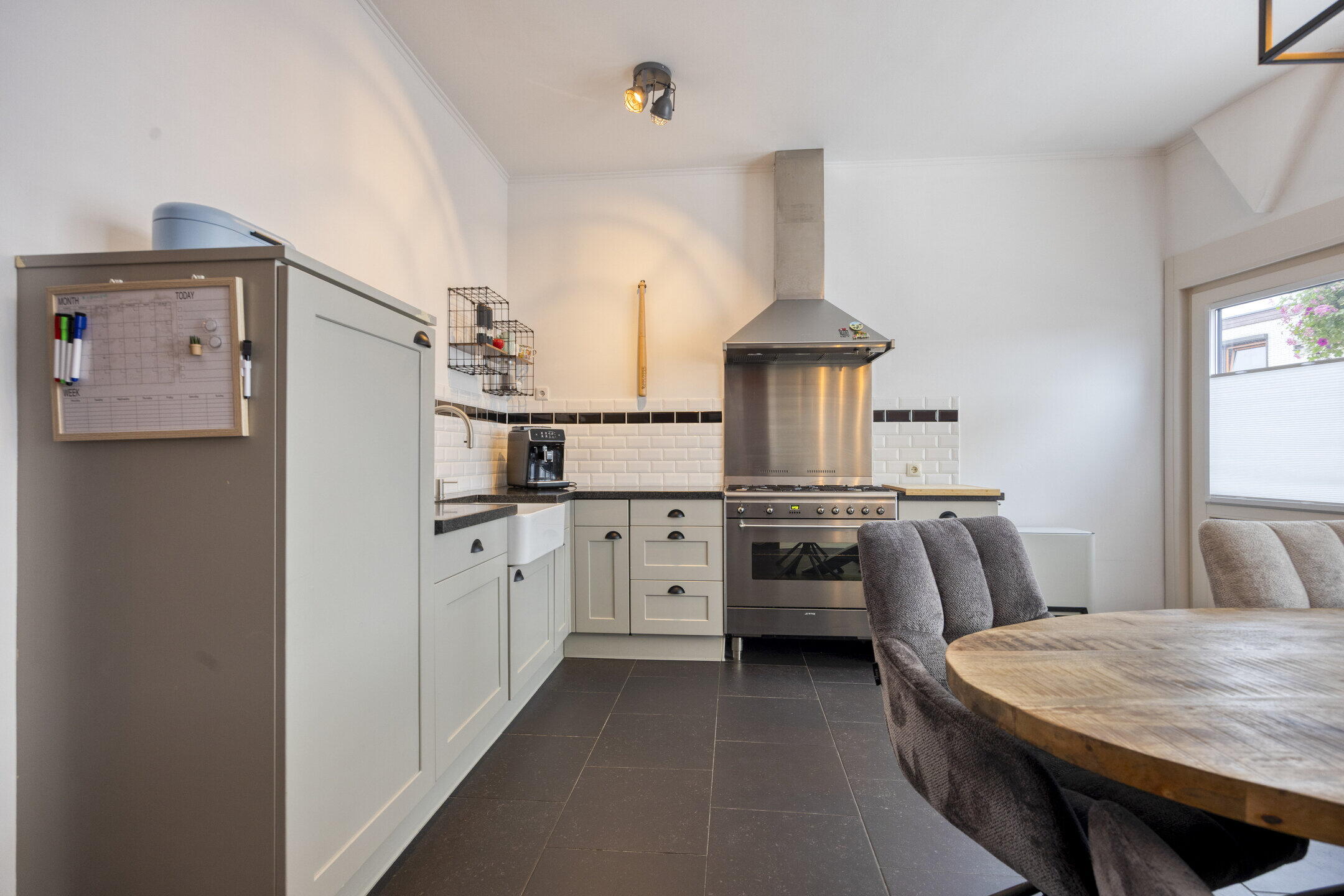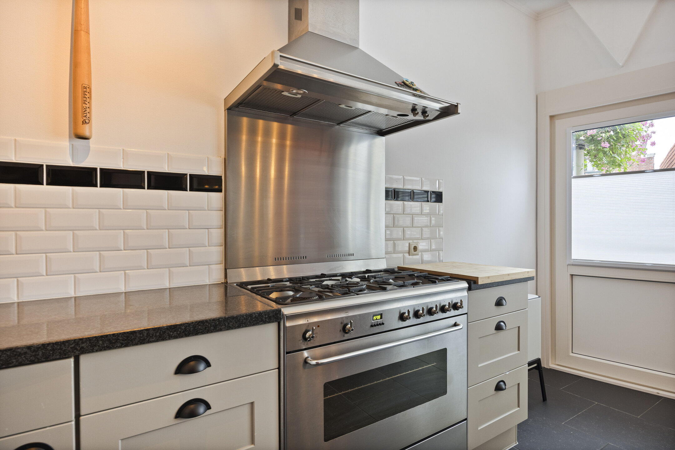 De woonkamer bevindt zich aan de achterzijde van de woning en is verdeeld in twee niveaus, gescheiden door twee tredes. Dit creëert niet alleen een speels effect, maar ook mogelijkheden qua indeling. Het hogere gedeelte is momenteel ingericht als thuiskantoor, maar kan ook dienen als leeshoek of speelhoek. Het lagere gedeelte biedt volop ruimte voor een gezellige zithoek met uitzicht op de tuin. Meerdere ramen in het dak zorgen voor een prachtige lichtinval en er is een airco voor extra comfort. Aan de voorzijde van de woning vinden we de gesloten keuken, waar je met gemak een eethoek voor zes personen kwijt kunt. De keuken is uitgevoerd in een stijlvolle groen-grijze kleur met zwarte handgrepen en een donker blad. Je vindt hier een fornuis, oven, afzuigkap, vaatwasser én een quooker. In de aangrenzende bijkeuken is ruimte voor wasmachine, droger én een extra koelkast.