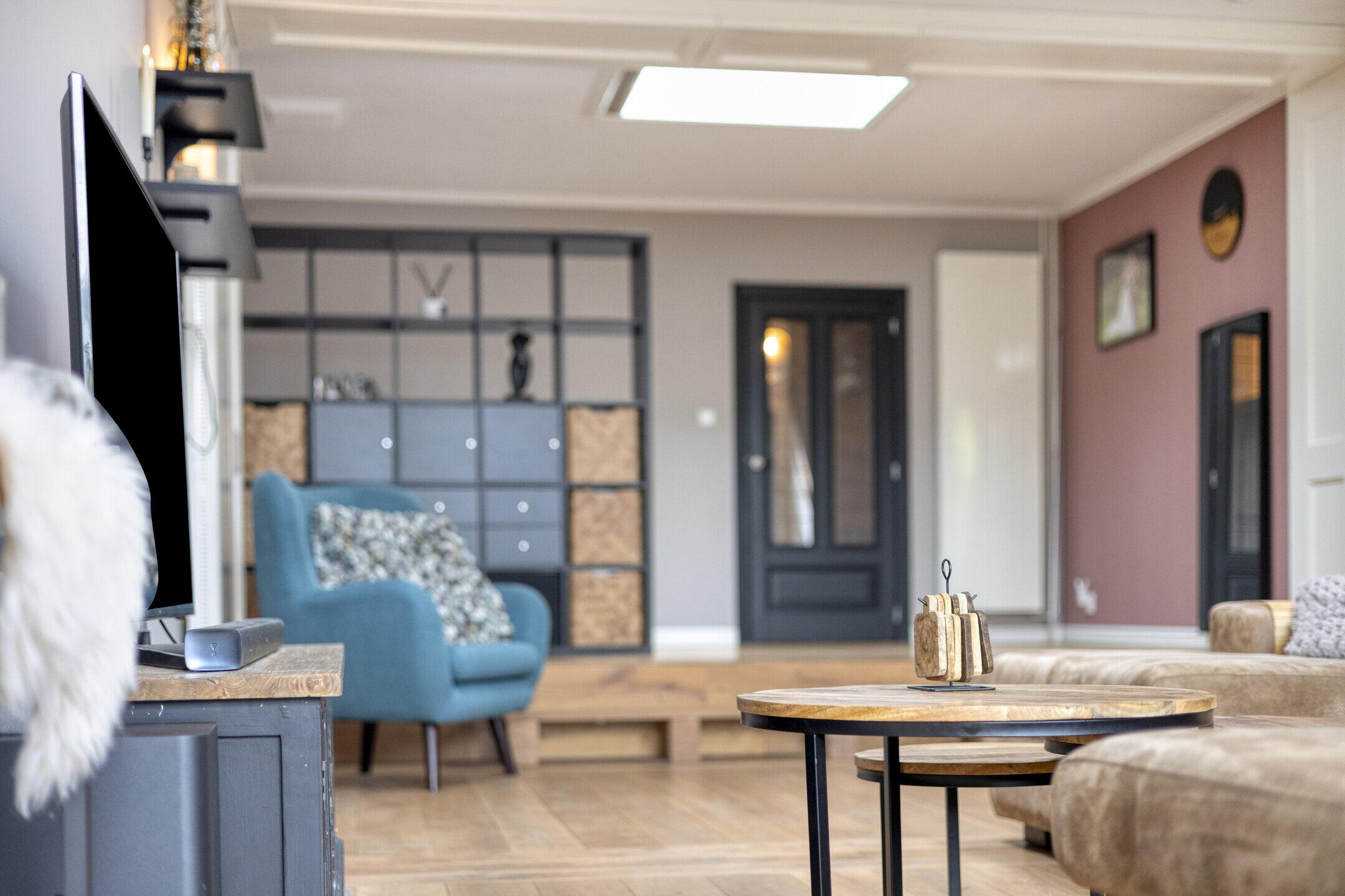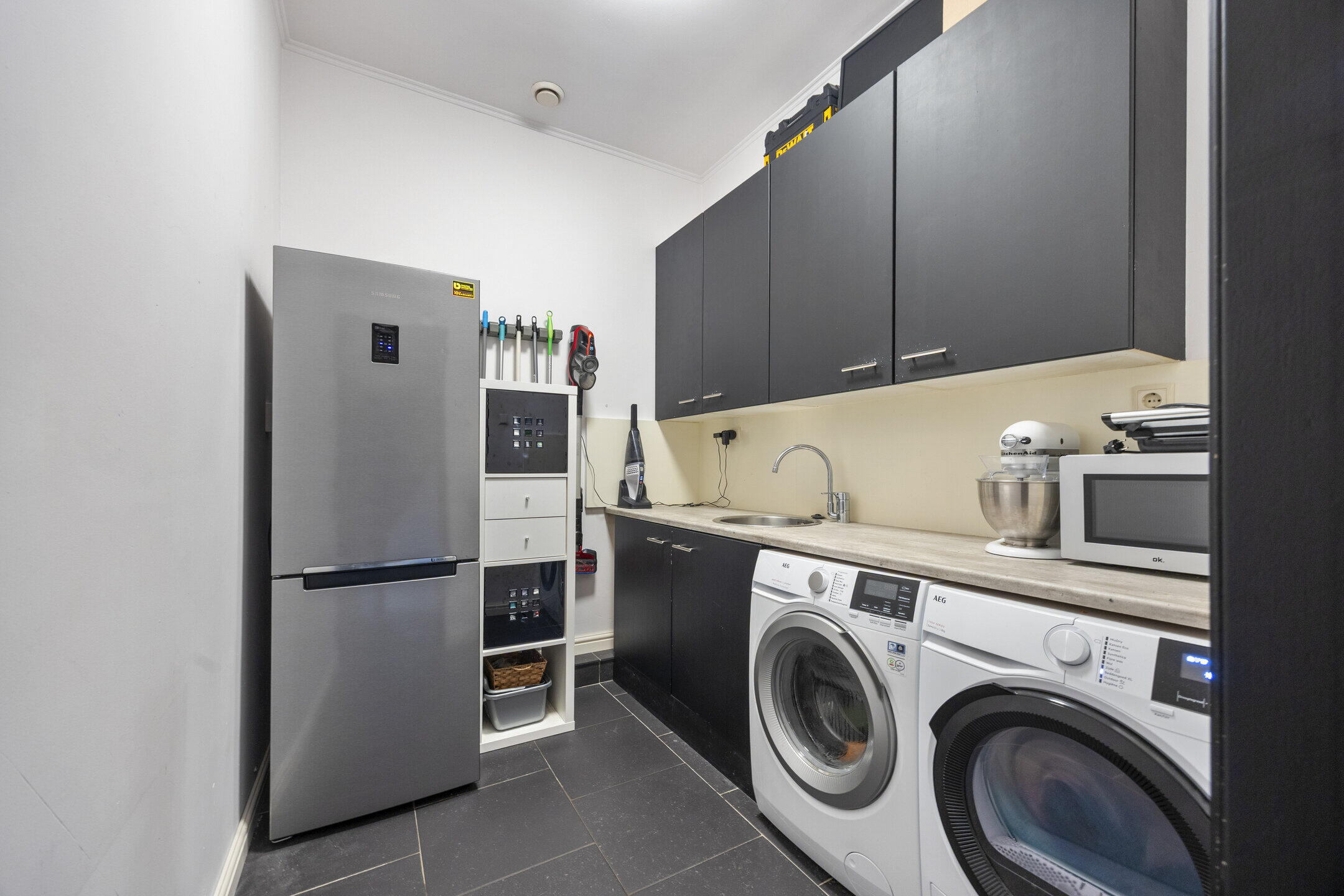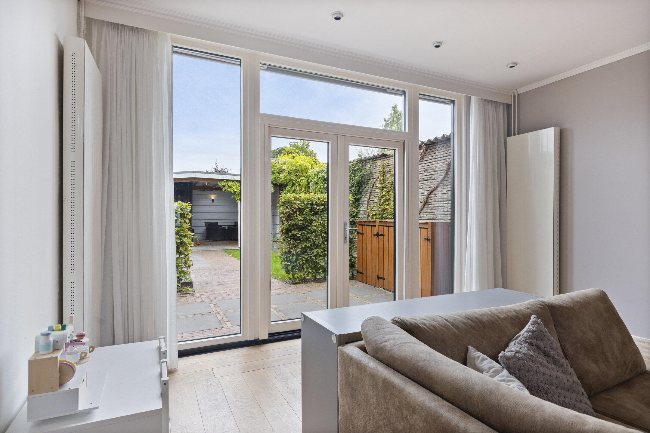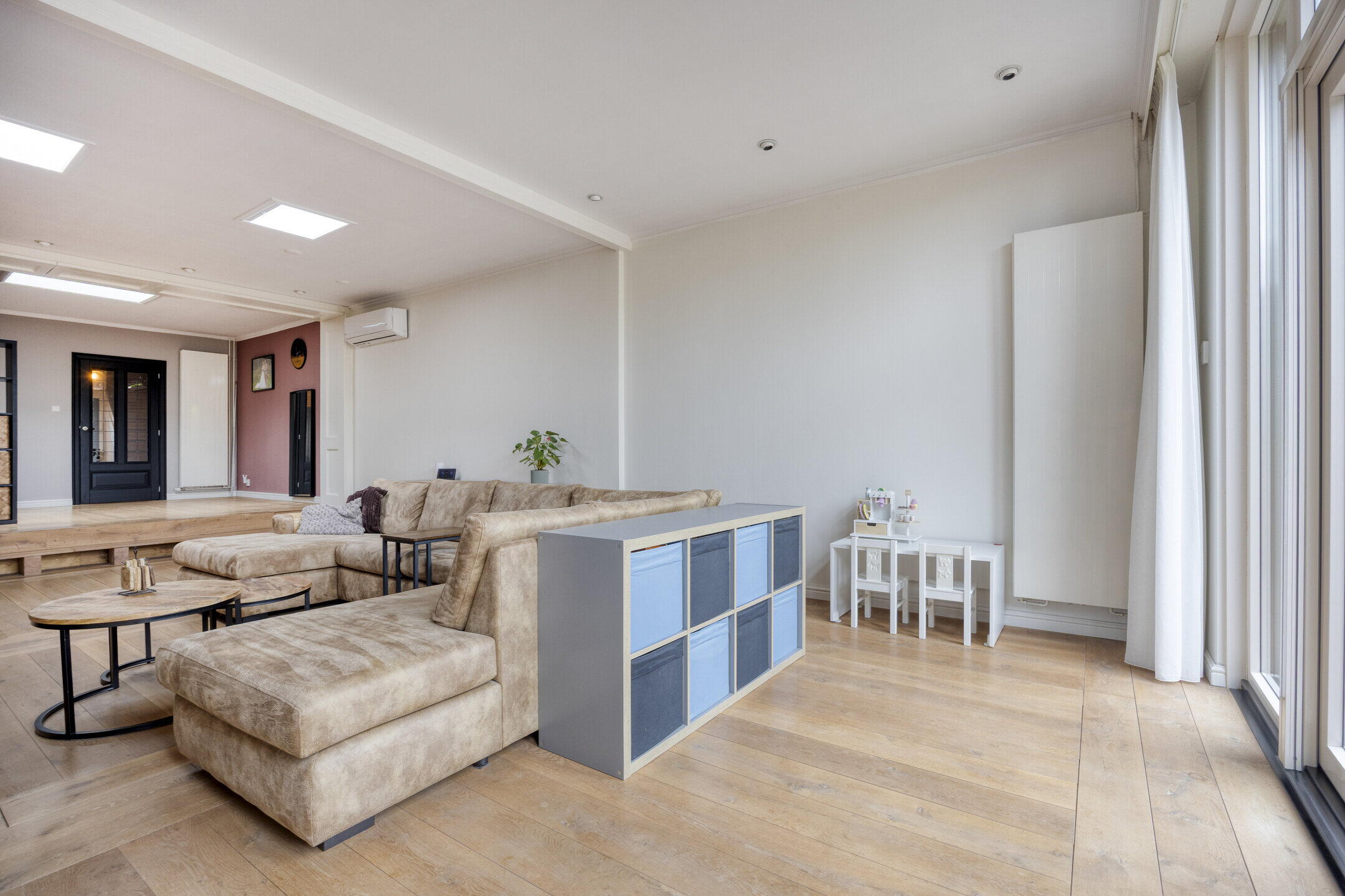 De woonkamer bevindt zich aan de achterzijde van de woning en is verdeeld in twee niveaus, gescheiden door twee tredes. Dit creëert niet alleen een speels effect, maar ook mogelijkheden qua indeling. Het hogere gedeelte is momenteel ingericht als thuiskantoor, maar kan ook dienen als leeshoek of speelhoek. Het lagere gedeelte biedt volop ruimte voor een gezellige zithoek met uitzicht op de tuin. Meerdere ramen in het dak zorgen voor een prachtige lichtinval en er is een airco voor extra comfort. Aan de voorzijde van de woning vinden we de gesloten keuken, waar je met gemak een eethoek voor zes personen kwijt kunt. De keuken is uitgevoerd in een stijlvolle groen-grijze kleur met zwarte handgrepen en een donker blad. Je vindt hier een fornuis, oven, afzuigkap, vaatwasser én een quooker. In de aangrenzende bijkeuken is ruimte voor wasmachine, droger én een extra koelkast.