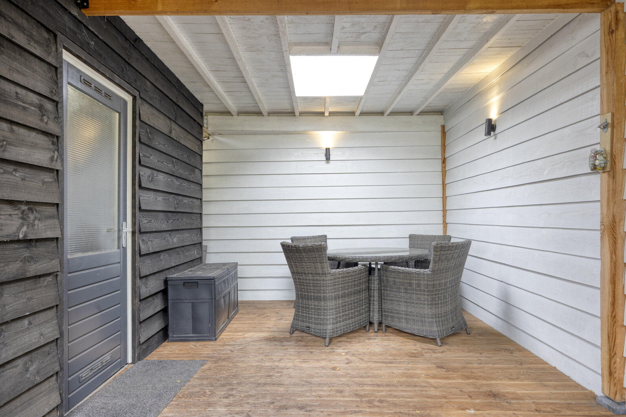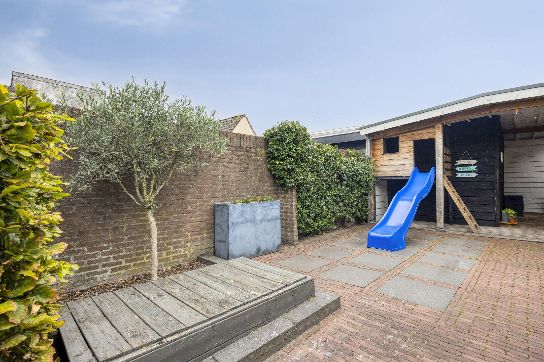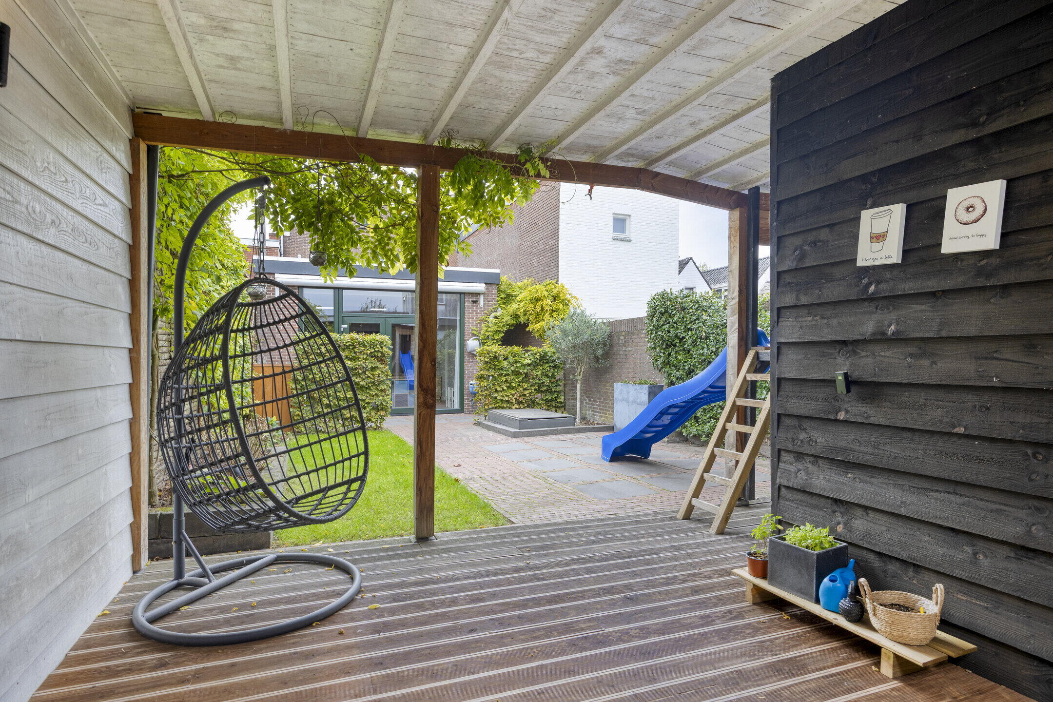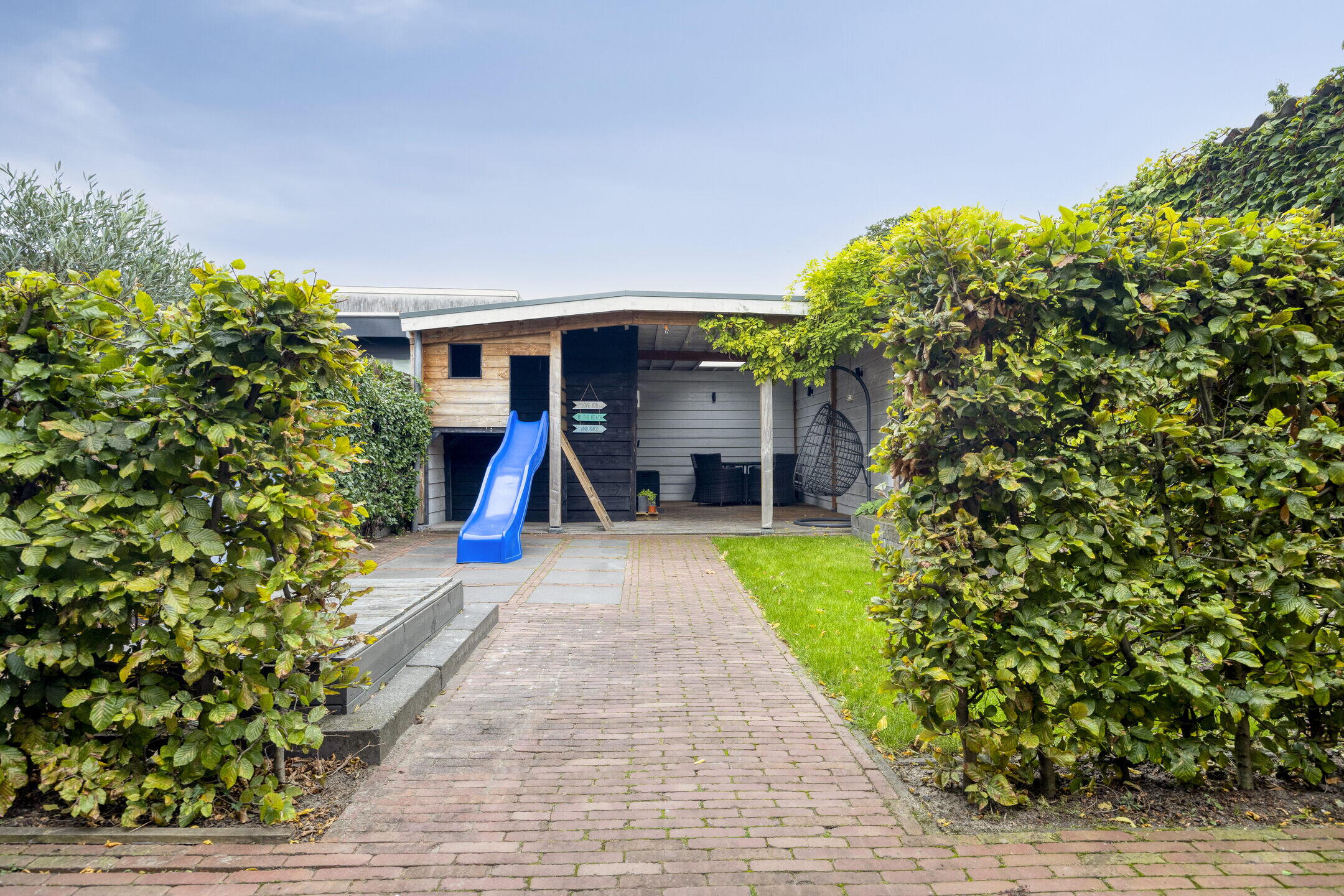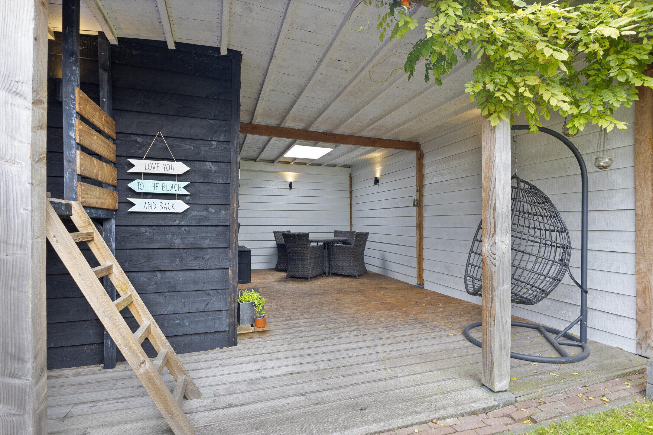 De achtertuin is bereikbaar via zowel de woonkamer als de hal. De tuin is verzorgd aangelegd met een combinatie van bestrating, gras en groene borders. Achterin staat een royale houten overkapping die aan de berging is vastgemaakt, perfect voor een loungehoek of eettafel. Hier geniet je van rust, privacy en lange zomeravonden.